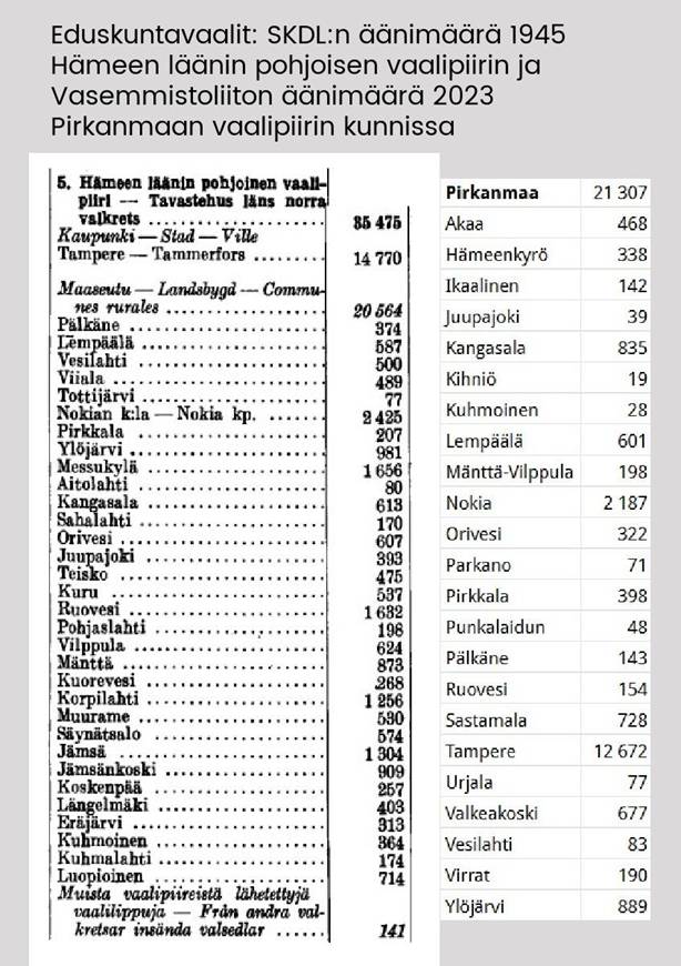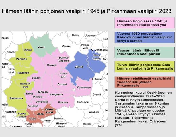 Vuoden 1945 eduskuntavaalien tuloksia alempana esittelevässä taulukossa on myös joukko muita kuntia, joita ei näy vuoden 2023 vaalituloksia esittelevässä taulukossa. Tampereen kaupunkiin on liitetty Messukylä (1947), Aitolahti (1966) ja Teisko (1972); Kangasalaan Sahalahti (2005) ja Kuhmalahti (2011); Oriveteen Eräjärvi (1973) ja pieni osa Jämsään liitetystä Längelmäestä (2007); Pälkäneeseen Luopioinen (2007); Ylöjärveen Viljakkala (2007) ja Kuru (2009); Nokiaan Suoniemi (1973) ja Tottijärvi 1976). Pohjaslahdesta liitettiin suurin osa Vilppulaan ja pienempi osa Virtoihin vuonna 1973. Mänttä ja Vilppula liitettiin yhteen Mänttä-Vilppulaksi vuonna 2009.