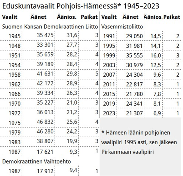 Vuonna 1945 valittiin Hämeen läänin pohjoisesta vaalipiiristä 11 ja vuonna 2023 Pirkanmaan vaalipiiristä 20 kansanedustajaa.