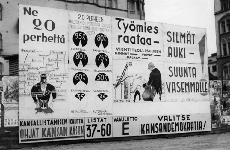SKDL:n näyttävä vaalimainos Keskustorilla vuoden 1948 vaalien alla. Sosiaalidemokraattien ‘Jo riittää’-kampanja puri kuitenkin äänestäjiin ja SKDL kärsi vaaleissa merkittävän tappion. (Kuva: Staf/ Kansan Arkisto)