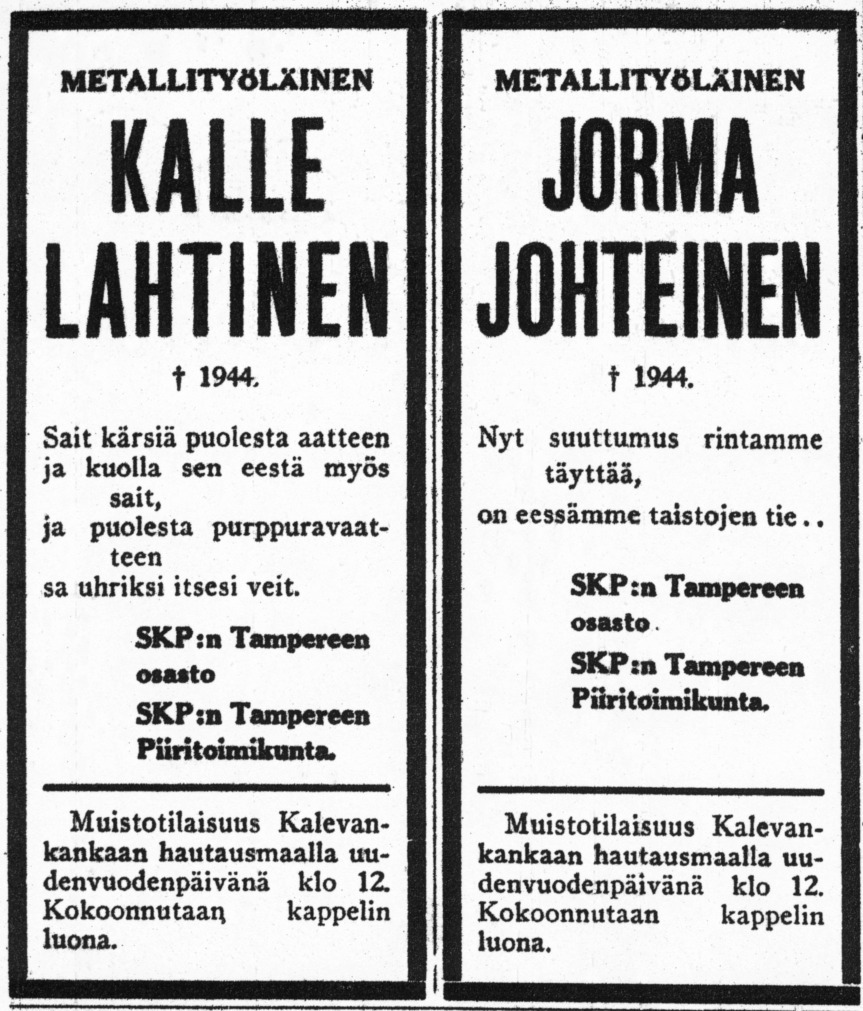 Kommunistit järjestivät uudenvuodenpäivänä 1945 ohranan sodan aikana surmaamien Kalle Lahtisen ja Jorma Johteisen muistotilaisuuden Kalevankankaan hautausmaalla. Paukkuvassa pakkasessa hautausmaalle marssi kymmeneksi tuhanneksi arvioitu joukko. Tilaisuus oli samalla mielenosoitus yhä jatkuvaa sotapoliitikkojen valtaa vastaan. (OS)