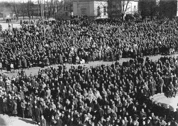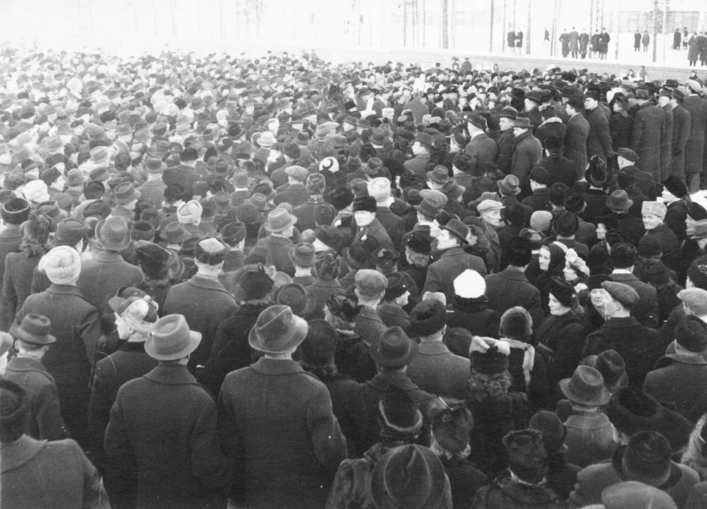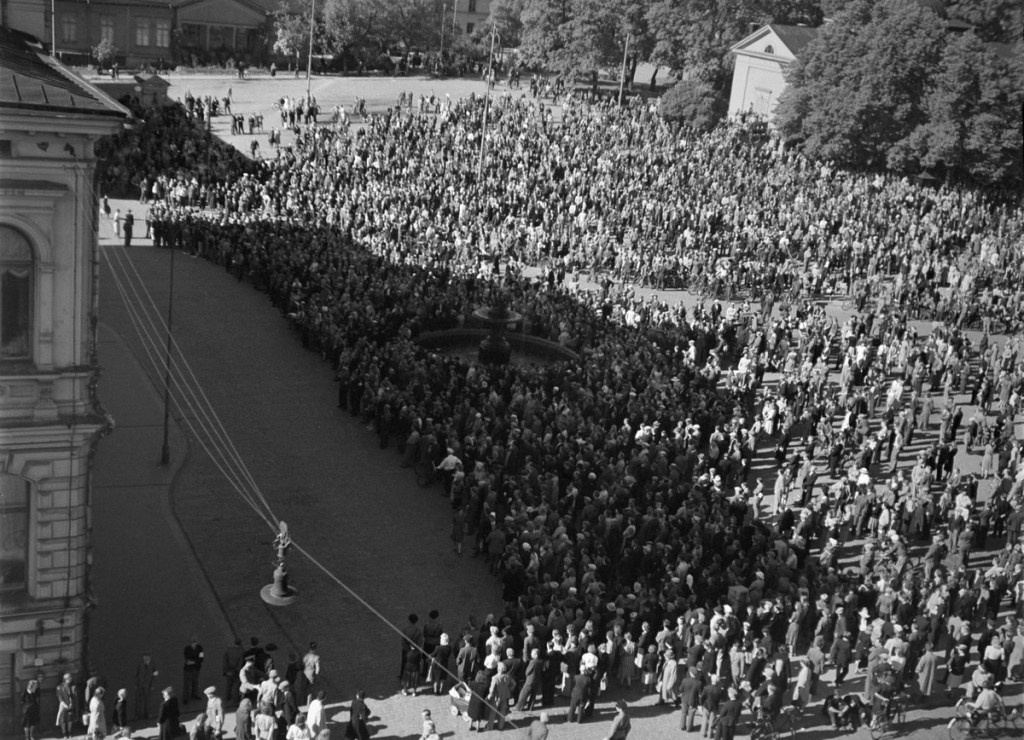 Haarlan lakkolaisia tukevia mielenosoittajia Keskustorilla 1945. (Kuva: Matti Poutvaara/Museovirasto)