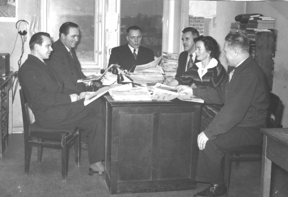Hämeen Yhteistyön toimitusneuvosto 1950-luvulla. Vasemmalta toimittaja Väinö Hakala, Erkki Nieminen, Erkki Koskinen, Vilho Hassinen, Saga Lahtinen ja päätoimittaja Arvi Laakso (Kuva: Työväenmuseo Werstas)