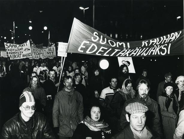 Rauhanmarssi Tampereen Hämeenkadulla 1980-luvulla. Etummaisessa banderollissa teksti ”Euro-ohjukset poistettava – ydinaseeton vyöhyke Pohjolasta Balkanille”. 1980-luvun rauhanmarssit kokosivat ennätysmäärän eri-ikäisiä mielenosoittajia; suurimmassa eli vuoden 1983 marssissa oli 13 000 osanottajaa. (Kuva Ari Johansson/Työväenmuseo )
