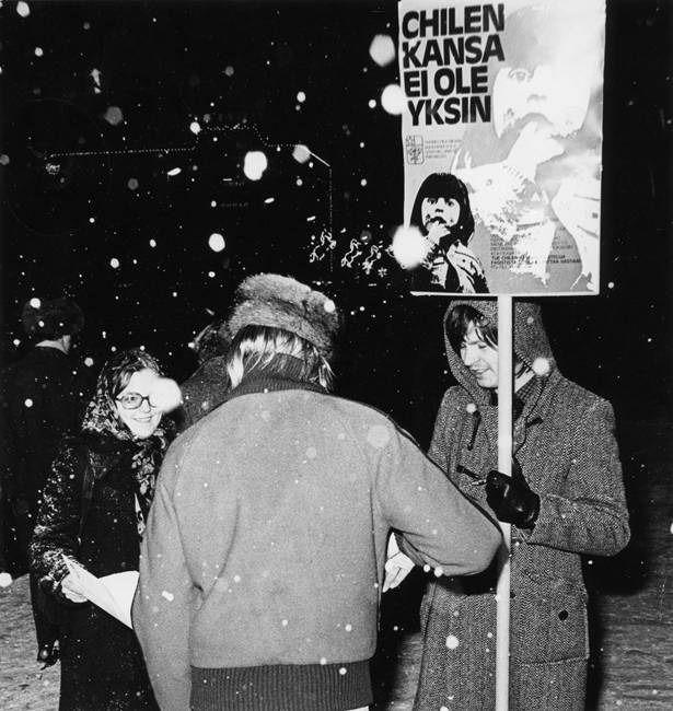 Chile-solidaarisuuskeräystä ja tiedotusmateriaalin jakoa Tampereen kadulla vallankaappauksen jälkeen. (Kuva: Työväenmuseo Werstas)