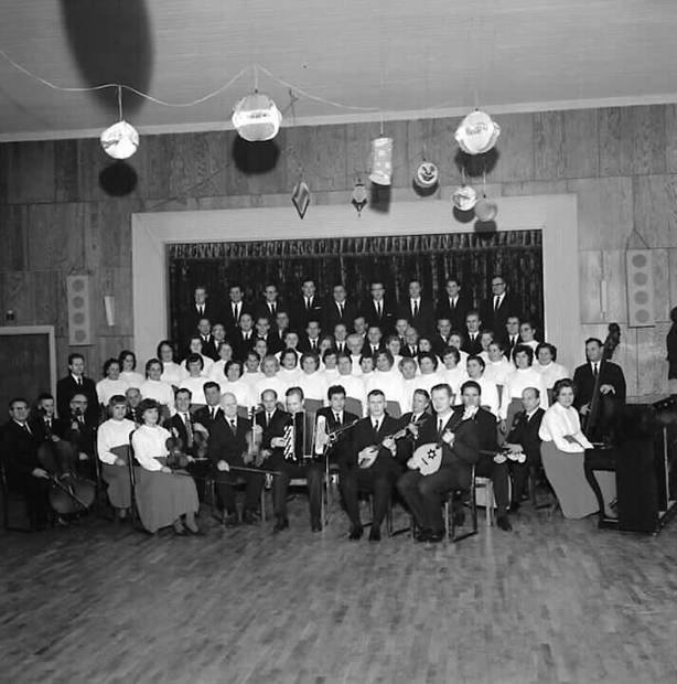 Kanerva-kuoro ja soitinyhtye 1960-luvulla Sorin järjestötalolla.