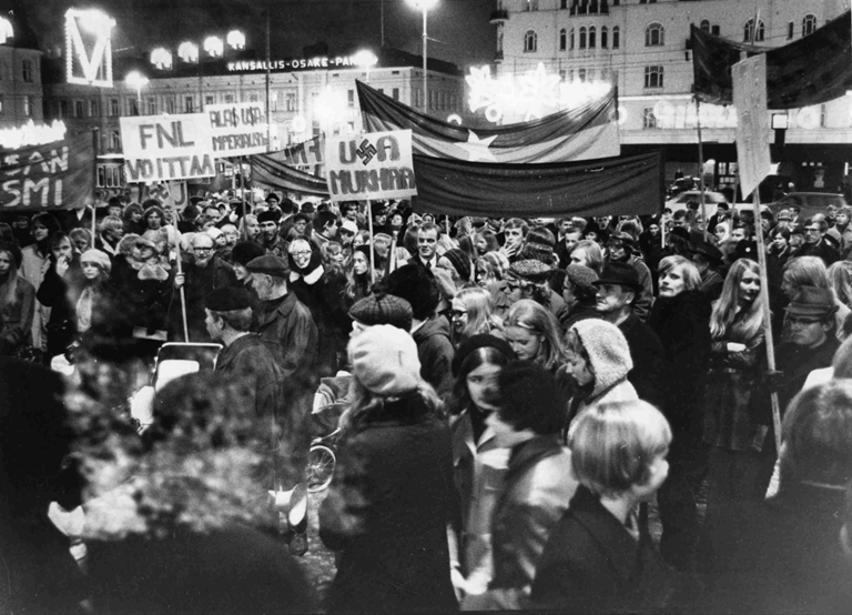 Vietnamin sotaa vastustava mielenosoitus Tampereen Keskustorilla 1970-luvun alussa. Tunnukset olivat terävöityneet: rauhan vaatimisen lisäksi tuomittiin USA:n imperialismi ja tuettiin Vietnamin kansallisen vapautusrintaman FNL:n taistelua. (Kuva: Kansan Arkisto)