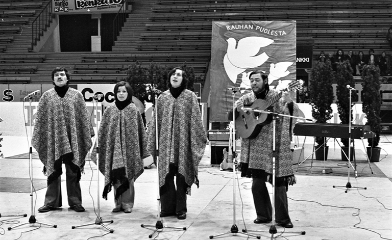Chilen Tampereella asuvien pakolaisten perustama Quarteto Chile esiintyi jäähallin rauhanjuhlassa.