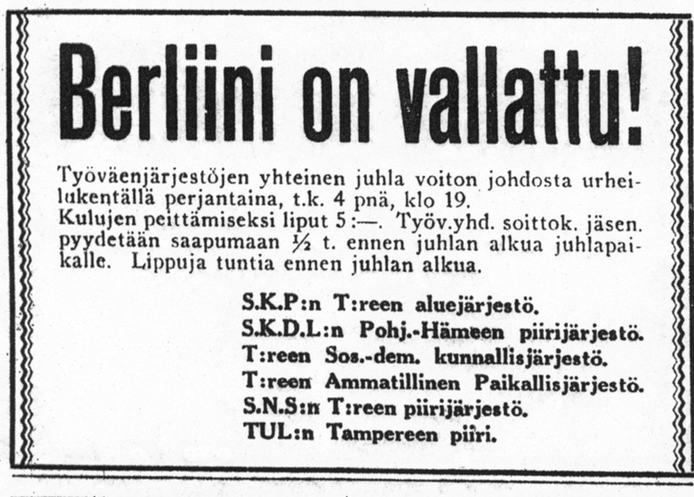 Vappuna 1945 vietettiin Tampereella SAK:n, SDP:n ja SKDL:n yhteisiä vappujuhlia, joissa oli osanottajia ennätysmäärä. Tällöin ainoan kerran ennen 1990-lukua ammattiyhdistysliike ja työväenpuolueet marssivat yhdessä vappuna vuonna 1945.
